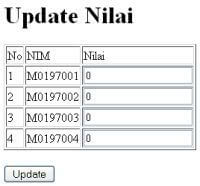 Dalam script di atas terdapat pula perintah <input type=”hidden” name=”n” value=”<?php echo $jumMhs ?>” />. Nilai ‘n’ ini nanti akan ikut disubmit untuk proses looping dalam membaca semua nilai dan NIM yang berasal dari form sekaligus menjalankan query SQL update data. Proses pembacaan dan menjalankan query update data ini dilakukan sebanyak n kali (sebanyak jumlah mahasiswa yang mengambil).