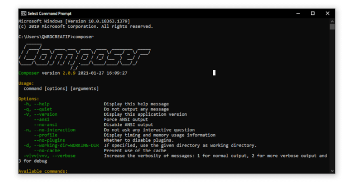 - Ketik Composer pada command prompt dan tekan Enter. Jika instalasi berjalan dengan sukses, Anda akan melihat gambar seperti di bawah ini!